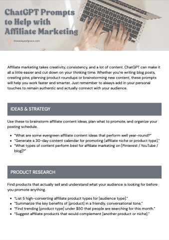 Over 25 prompts for content ideas, blog posts, Pinterest pins, and more all designed to save time and maximize your affiliate income!